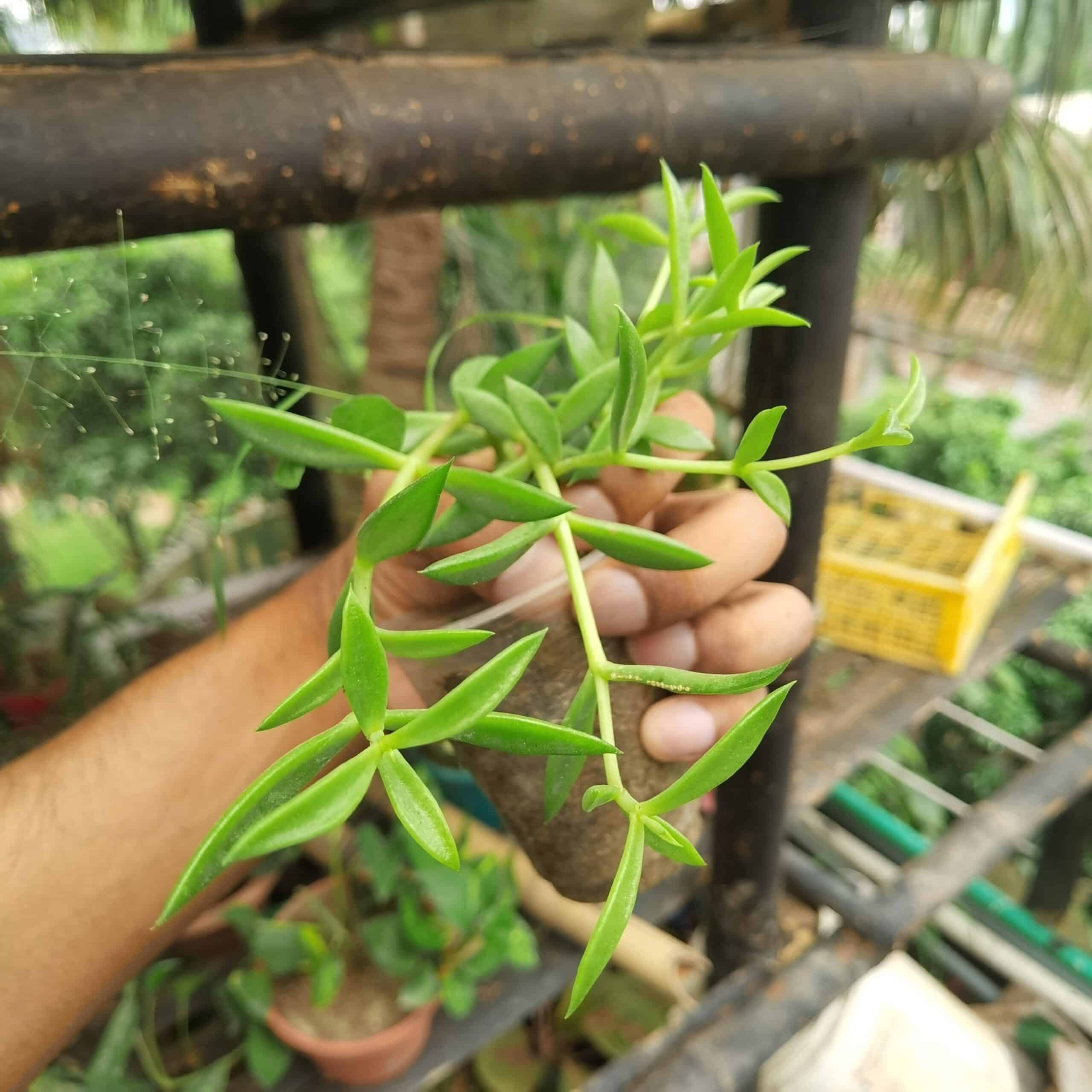 বর্ণনা: Ruby Necklace Plant একটি সাকুলেন্ট উদ্ভিদ যা তার লম্বা, সরু, এবং রুবির মতো লাল রঙের পাতা ও কাণ্ডের জন্য পরিচিত। এই পাতাগুলি সিলিন্ড্রিক্যাল এবং দীর্ঘায়িত হয়, যা চমৎকার ঝুলন্ত বা ট্রেলিং ইফেক্ট তৈরি করে। গ্রীষ্মকালে এই উদ্ভিদটি ছোট, হলুদ রঙের ফুল ফুটায় যা অত্যন্ত আকর্ষণীয়।